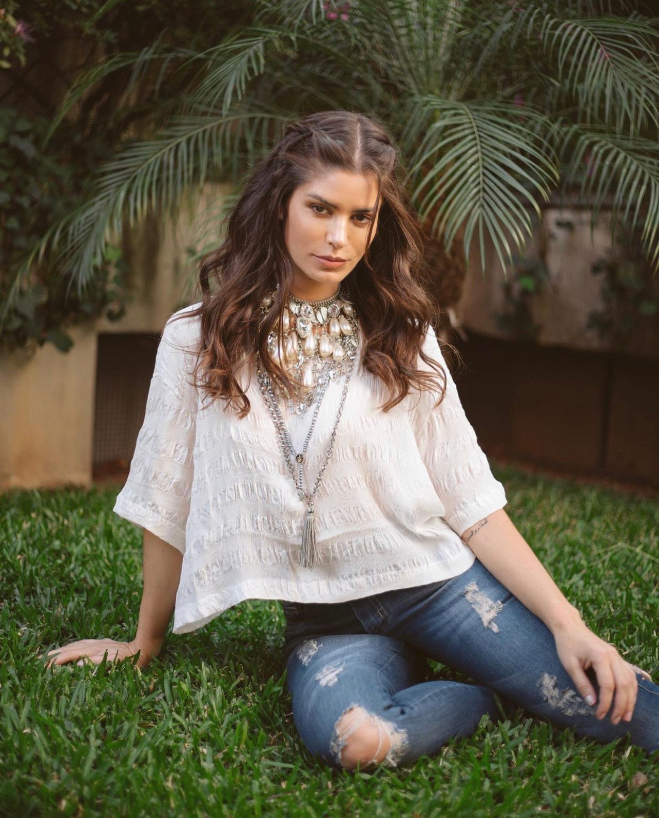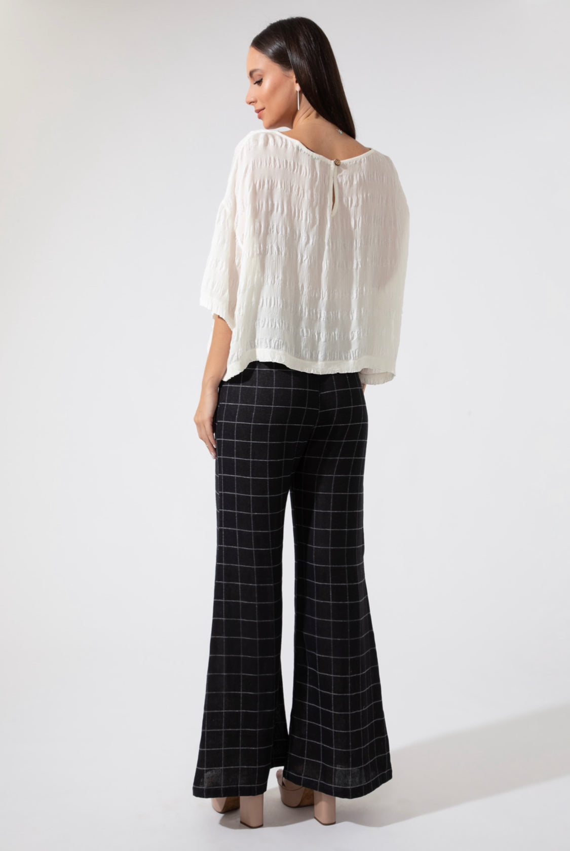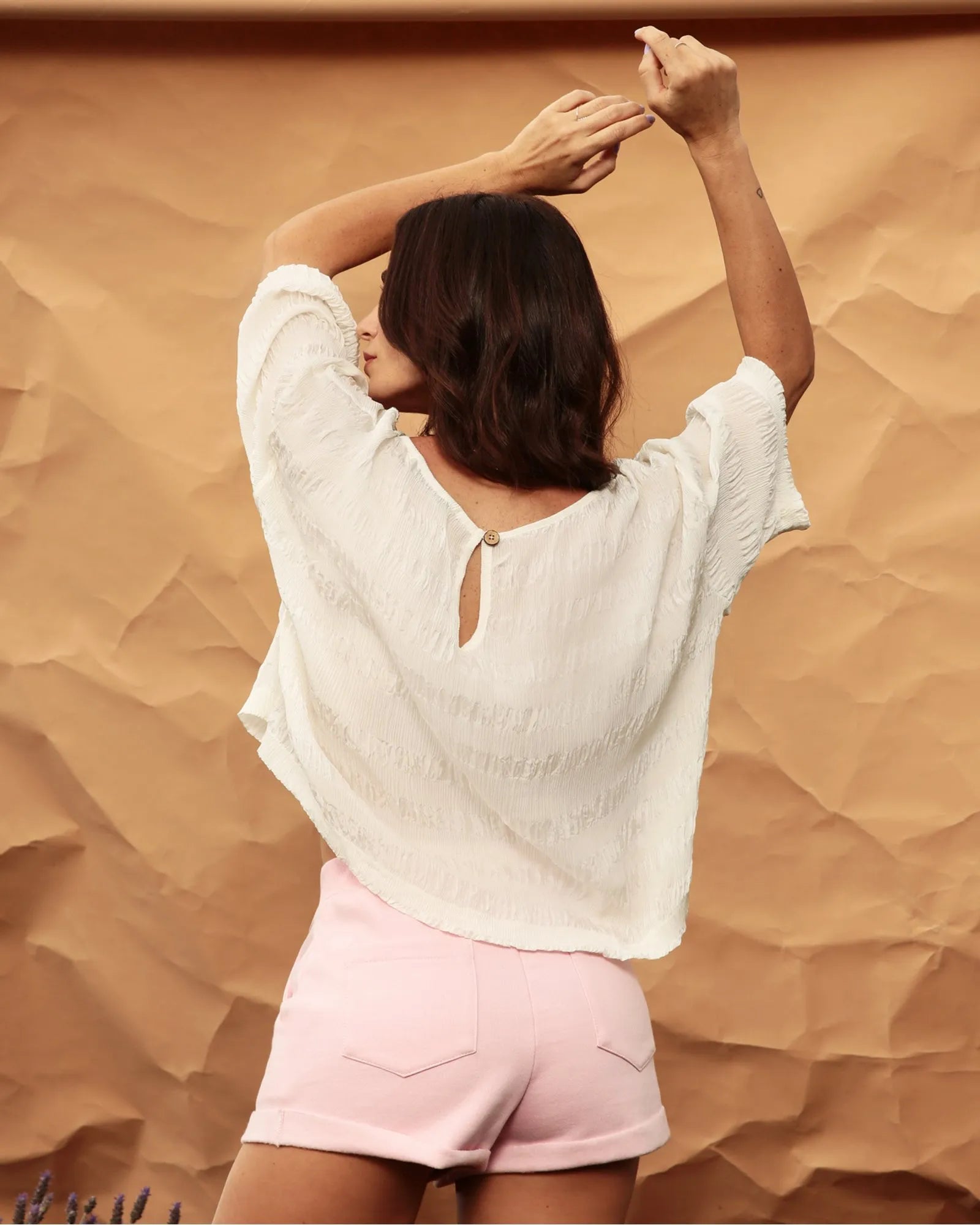 A peça confeccionada à mão possui tecido ecologicamente certo, feito em crepe de seda. Esta bata apresenta um design romântico, atemporal e é oferecida exclusivamente em cor cru.